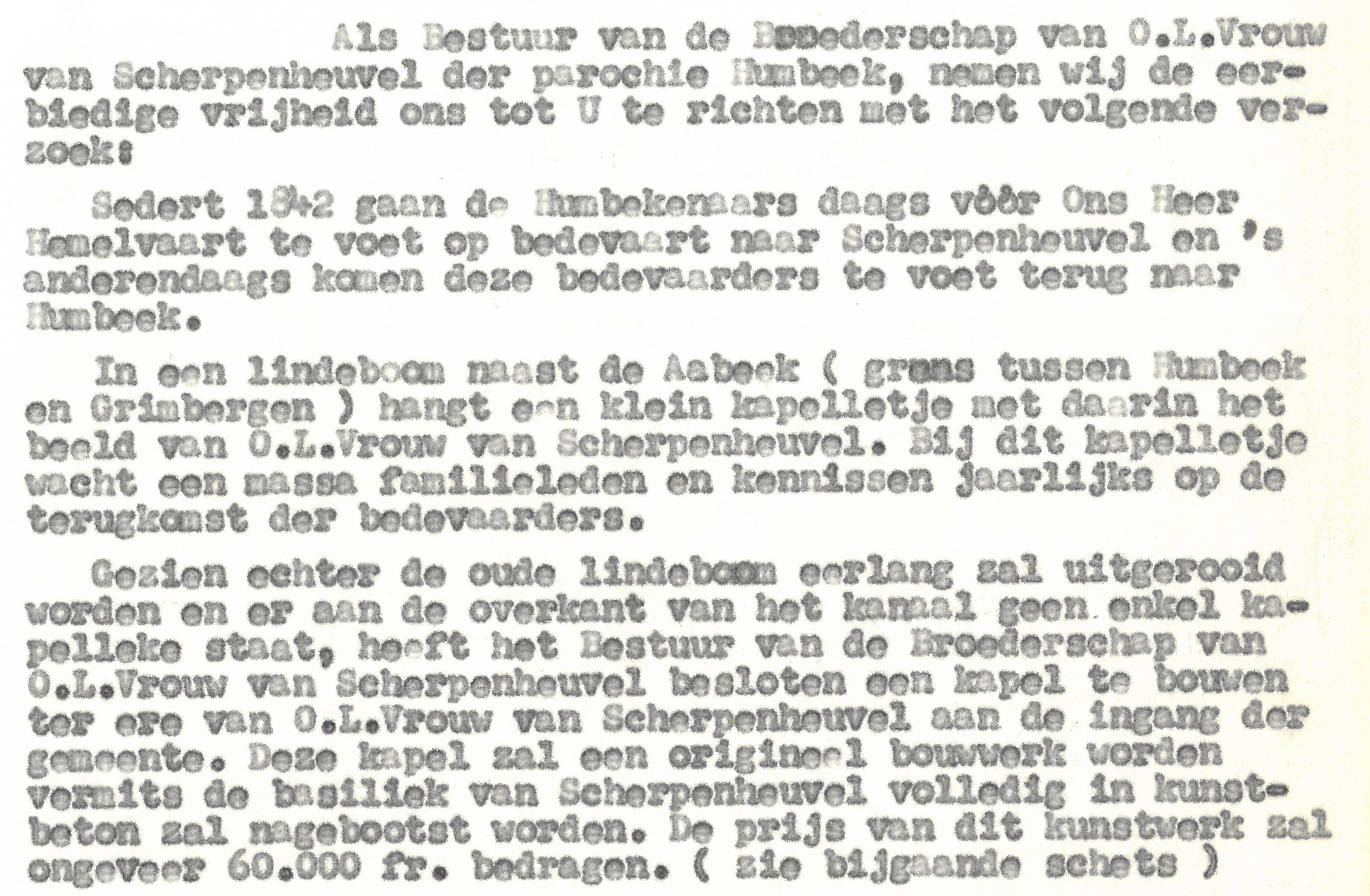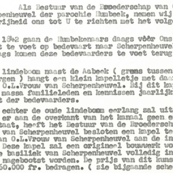 Het perceel in de Kanaalstraat, waar nu de woning met huisnummer is gebouwd, werd in 1965 aangekocht door de Broederschap met de bedoeling er een kapel te bouwen in de vorm en met het uitzicht van de basiliek te Scherpenheuvel.